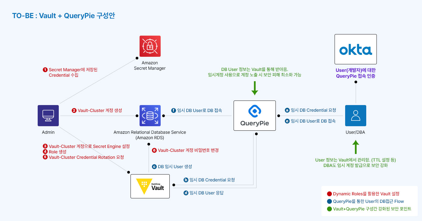QueryPie(DAC/SAC) + Vault(암호화키관리) + Okta(계정관리) 제품을 결합하여 강력한 통합 보안서비스를 제공합니다.