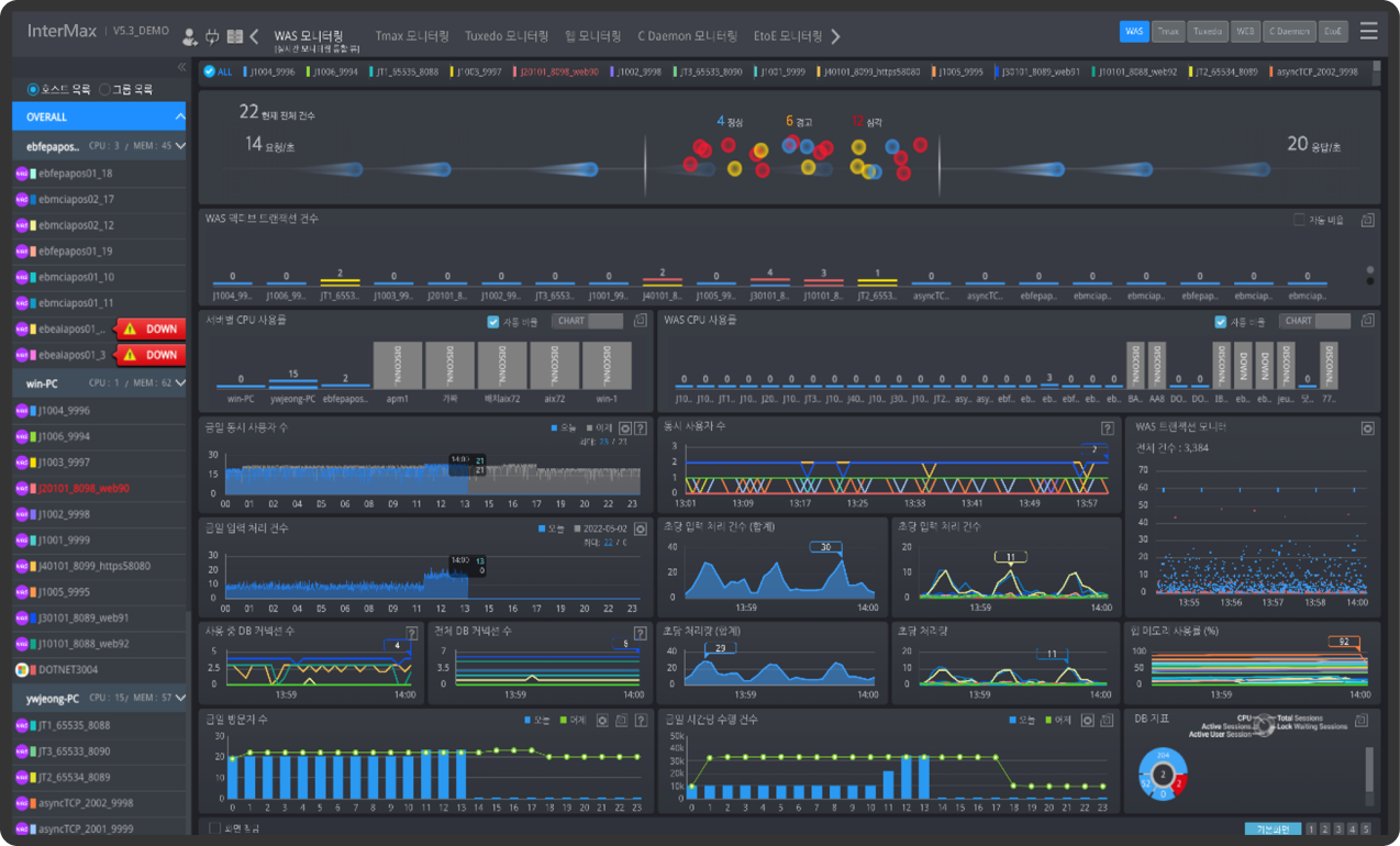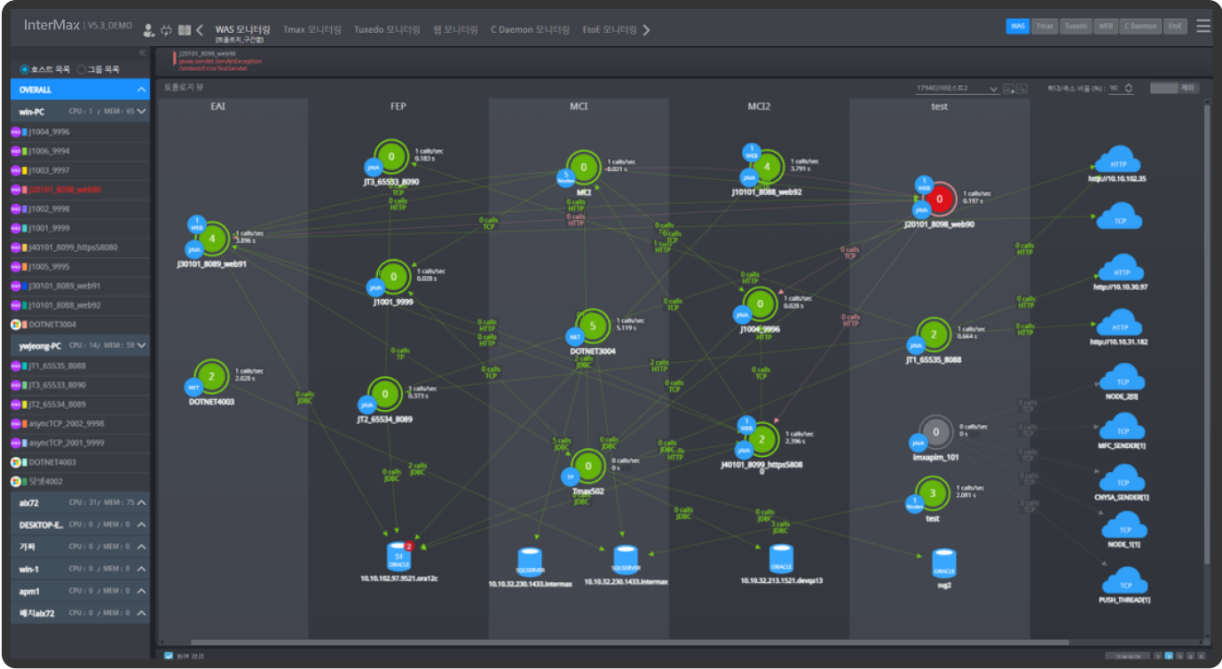 InterMax는 애플리케이션 서버와 데이터베이스 서버 등 전 구간의 성능 관리를 통합적 / 효율적으로 수행하기 위한 애플리케이션 성능 모니터링 솔루션입니다. N-Tier로 구성된 복잡한 비즈니스 서비스 환경에서 사용자 요청부터 내부 WEB-WAS-DB-외부 시스템 연계 구간 (EAI/FEP 등)까지 End-to-End 트랜잭션 추적 기능을 제공합니다.